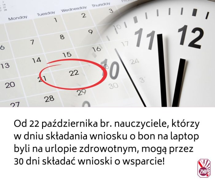 Nauczyciele, którzy w dniu składania wniosku o bon na laptop, przebywali na urlopach dla poratowania zdrowia, mogą od 22 października br. przez 30 dni składać wnioski!